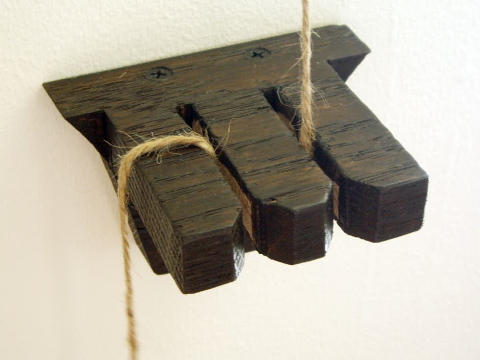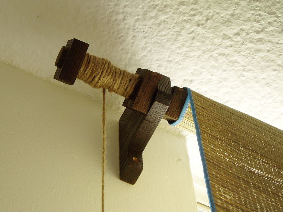 I designed the curtains using SketchUp. The mats would roll up on a wooden dowel. A string drives the dowel up and down, raising or lowering the the curtains. An anchor nailed to a wall keeps the string at a desired tension, stopping the curtains from rolling themselves down.