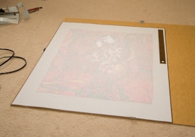 3 It was helpful to have a template to check the size of the frame in each step of the project. I simply laid the artwork on top of the labelling paper that came with the frame, then traced its outline with a knife.