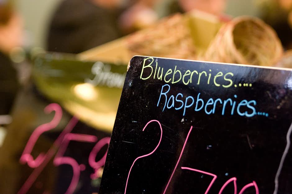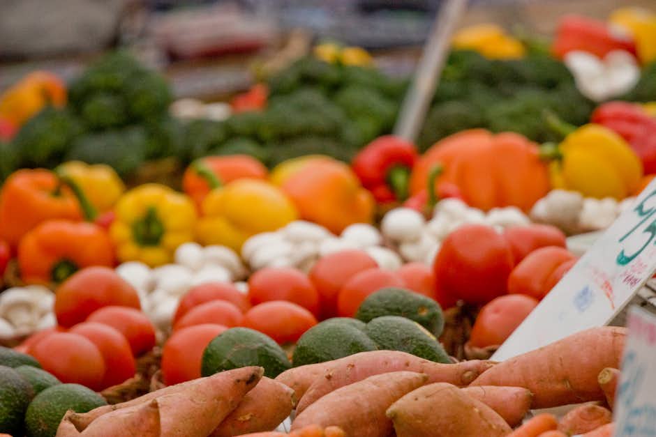 Fresh tomatoes, mushrooms, and other farm products sold by the wicker basket.