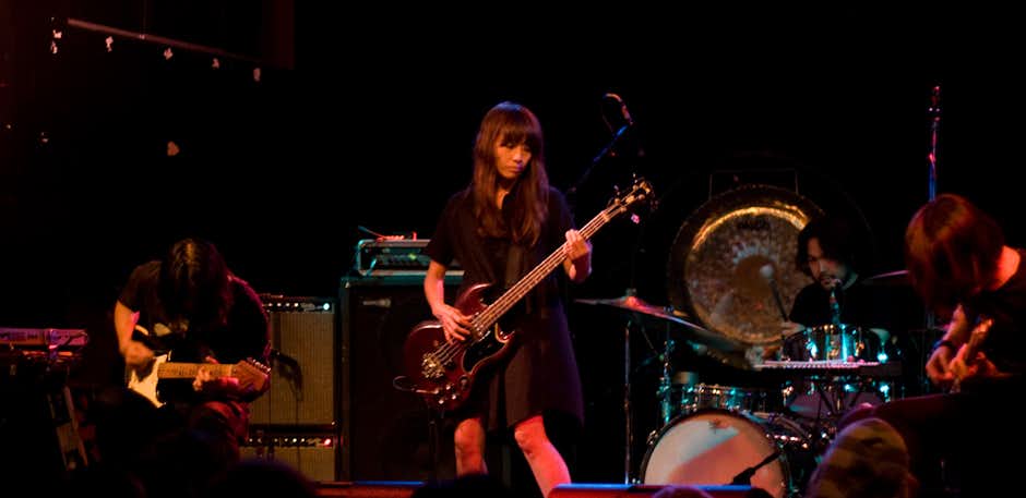 Tamaki Kunishi tuning her bass guitar after a performance by Maserati