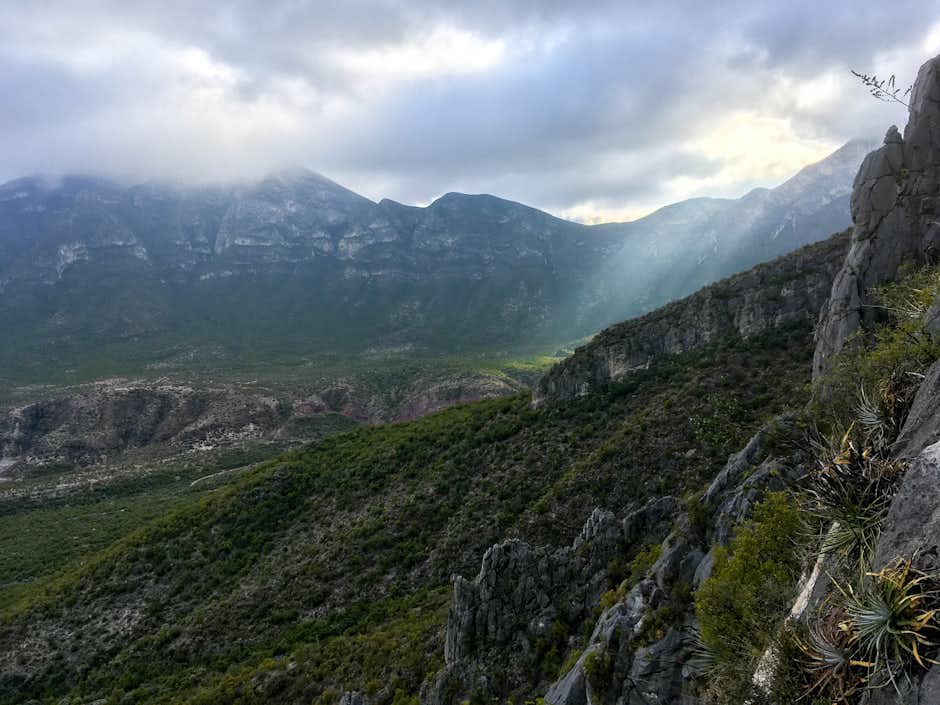 I turned my head around and saw sun streaks breaking through the clouds, illuminating a distant plain. I wondered what it would look like if I could get over the ridge and see the whole thing. Or stand at the end of the rays and look up at the cliff, possibly at more routes.