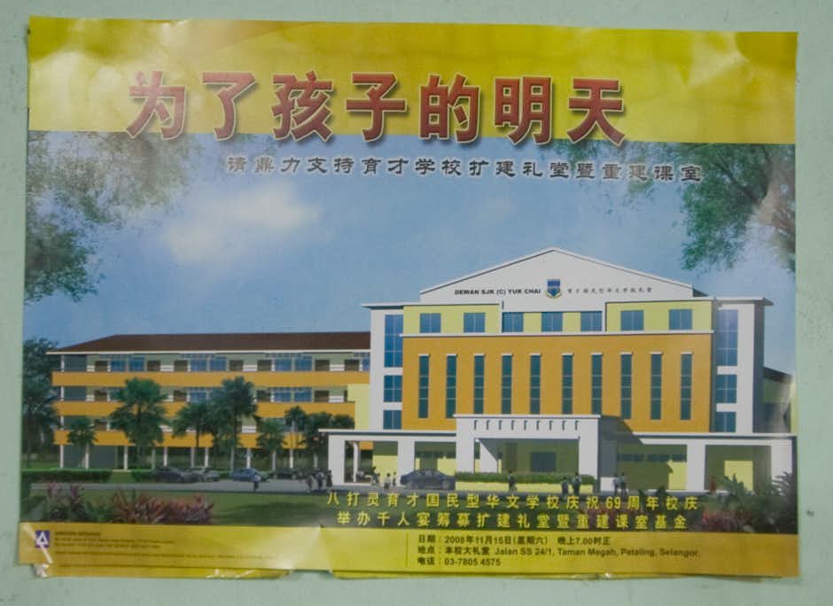 A poster announcing a fundraising gala for an expansion of the main hall, to coincide with Yuk Chai’s 69th anniversary. Government funding is limited for vernacular schools, where Mandarin is taught extensively as part of the curriculum in the school. But high student enrolment ensures continued stream of donations to keep these schools operating and expanding.