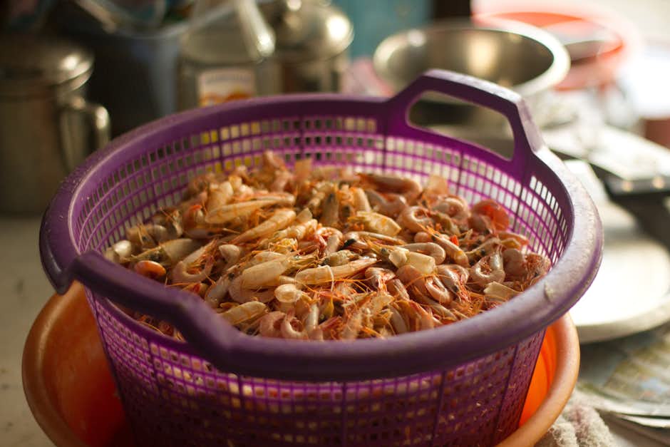 A basket of shrimp shells being prepared to become the soup base for the prawn noodle soup.