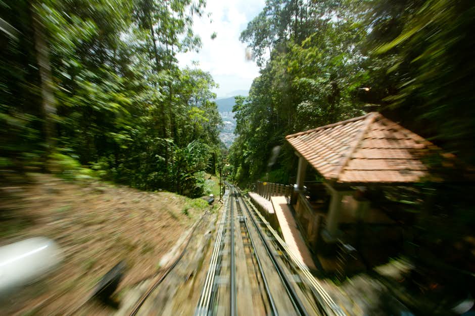 Going down on a funicular that ferries tourists up Penang Hill, 833 meters above sea level.